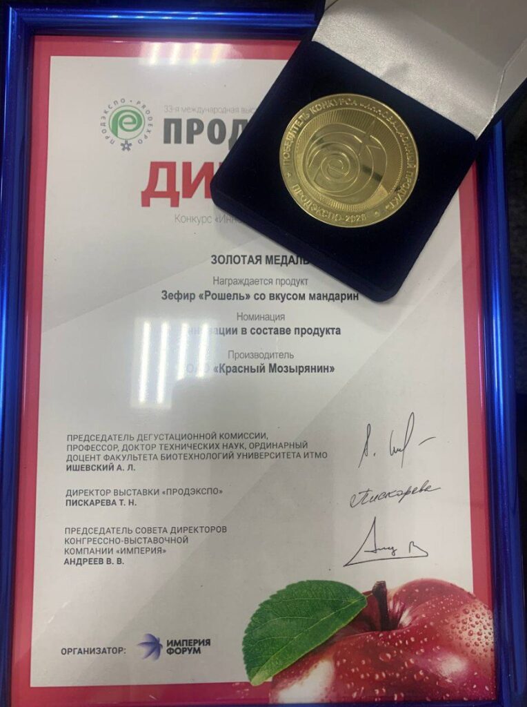 На 33-ей Международной выставке «ПРОДЭКСПО-2026» в Москве ОАО «Красный Мозырянин» награжден золотой медалью в номинации «Инновации в составе продукта» за выпуск зефира «Рошель» со вкусом мандарина.